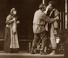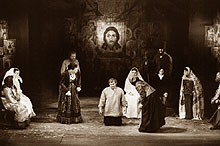 Bóg w cerkiewnym wydaniu wśród tych "ludzi prawosławnych" obecny jest w przedstawieniu w bardzo pięknej scenografii Ewy Starowieyskiej: ikony w tle z motywami ołtarzowymi. Do tego dochodzą oszczędne elementy naturalistyczne dla określenia zmieniających się miejsc akcji.[...]