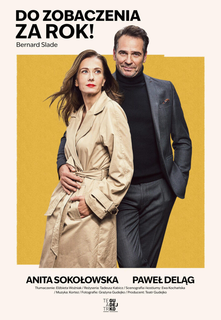 Niezwykła miłość z datą w kalendarzu. Spotkanie raz w roku, a emocji na całe życie. „Do zobaczenia za rok” to współczesna, polska wersja amerykańskiej sztuki „Same Time, Next Year”, pełna humoru i wzruszeń opowieść o wyjątkowej więzi dwojga ludzi. Jola (Anita Sokołowska) i Jurek (Paweł Deląg) poznają się przypadkiem w pensjonacie i – mimo że oboje mają rodziny – spędzają razem noc, a następnego dnia postanawiają spotykać się w tym samym miejscu, o tej samej porze, każdego roku. Przez kolejne dziesięciolecia śledzimy ich coroczne spotkania, które stają się zwierciadłem zmieniających się czasów, poglądów i życiowych wyborów, a zabawne dialogi przeplatają się z momentami głębokiej refleksji, podczas gdy relacja bohaterów – niepozorna i zakazana – dojrzewa, stając się symbolem przyjaźni, miłości i ludzkiej potrzeby bliskości. Spektakl zachwyca inteligentnym humorem, ciepłem i nostalgicznym spojrzeniem na ludzkie losy, tworząc historię, która bawi, wzrusza i skłania do zadania sobie pytania: czy miłość ma swój czas i miejsce?